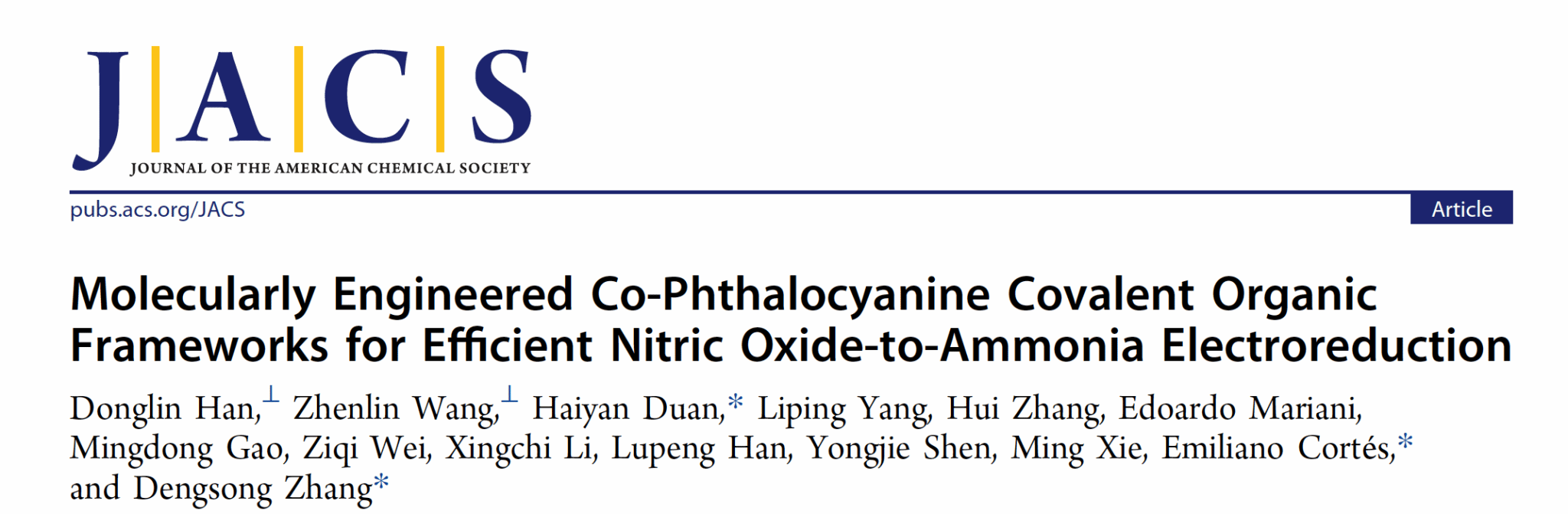 化石燃料燃烧、钢铁冶炼及垃圾焚烧等工业过程排放的氮氧化物,会诱发酸雨、光化学烟雾及细颗粒物生成,既加剧大气污染,又威胁人体健康,实现其持续深度减排与高效净化至关重要。 当前广泛应用的选择性催化还原技术,虽以氨为还原剂可在特定温度下将NO转化为氮气、具备较高实用潜力,却无法回收烟气中的氮资源。而采用电催化还原技术将其转化为氨等高附加值化学品,既能高效回收宝贵氮资源,又能实现烟气氮氧化物的综合治理与资源化,对推动氮循环优化及可持续发展具有关键意义。然而,NORR过程(NO + 5e− + 5H+ → NH3 + H2O)涉及多步质子-电子转移与复杂中间体演变,且易生成多种副产物(如H2, N2, NH2OH, N2H4等)。其核心瓶颈在于催化剂难以精准调控中间体(如HNO/NOH与NH3)的吸附强度:过弱会阻碍加氢步骤,过强则导致NH3脱附困难,从而降低氨产率与法拉第效率。共价有机框架作为一种新兴的通过共价键连接的晶态有机多孔材料,具有可调的周期性孔道、可设计拓扑结构和原子级分散的活性位点,在吸附、催化等领域大放异彩。这类新型共价有机框架为调控催化界面与中间体的吸附强度,揭示复杂的电催化反应机制,追踪催化界面电子和质子的动态演变过程提供了独特的研究视角。
