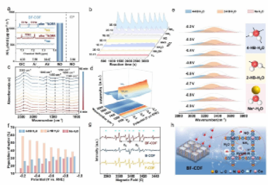 接着,为获取中间体信息并确定BF-COF上NORR的反应路径,研究团队采用原位差分电化学质谱(DEMS)、原位衰减全反射表面增强红外吸收光谱(ATR-IRAS)及电子顺磁共振(EPR),捕获反应中间体与催化界面吸附物种。借助同位素标记实验及对照试验证实氮源来自NO;DEMS检测到*NO、*HNO等中间体及NH3信号,结合原位红外确定反应路径为*NO→*HNO→*NH2O→*NH2OH→*NH2→*NH3;ATR-IRAS显示1200 cm-1(*NH2OH)等峰及3100-3700 cm-1界面水信号,通过拟合发现低电位下Na+—H2O比例升至30.4%,表明BF-COF促进水的解离;EPR证实其产*H能力最优。吡咯-N位点比桥式-N更利于水吸附解离,Co与吡咯-N协同构建富*H环境,生成的*H可即时用于氢化并维持浓度动态平衡。