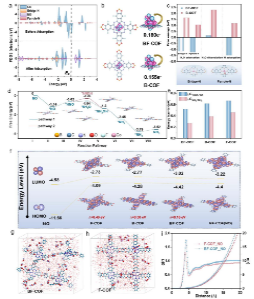 最后,研究团队通过理论计算与分子动力学模拟,进一步证实了BF-COF的NORR催化反应路径和机理。PDOS谱显示NO吸附后BF-COF中Co 3d轨道与NO的N 2p轨道显著重叠,证实二者强相互作用;差分电荷密度与Bader分析表明BF-COF与NO的电子相互作用强于B-COF,且Co位点使NO吸附能降低,证实Co是NO吸附活化主活性中心;吡咯-N位点水吸附解离的能量优势显著高于桥-N,证实其是*H供应关键位点;通过反应能垒对比,BF-COF生成*HNO与*NH₃脱附的能垒均低于B-COF、F-COF;通过HOMO-LUMO能级图发现BF-COF与NO的能级差最小,利于电子转移;通过分子动力学模拟发现BF-COF周围NO聚集更紧密,对NO吸附亲和力更强。Co位点(吸附活化NO)与吡咯-N(提供*H)的协同作用,促进高效催化机制:Co位点启动NO活化,吡咯-N介导水离解提供充足*H,*HNO路径能垒低且*NH₃易脱附,清晰阐明了BF-COF在NORR中的Co-吡咯-N协同催化机制。