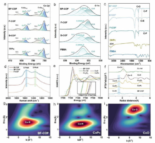 随后,研究团队借助粉末 X 射线衍射、高分辨透射电子显微镜对其进行了结构和形貌表征,BF-COF 在(100)晶面的明显衍射峰和(001)晶面 0.35 nm 的晶格条纹表明其长程有序的多孔结构。通过 XPS、XANES 和 EXAFS 阐明了 BF-COF 中 Co 的化学价态及局域配位环境,Co 通过与 COFs 中吡咯-氮基团配位锚定在框架中,且存在 Co2+与Co3+共存状态。