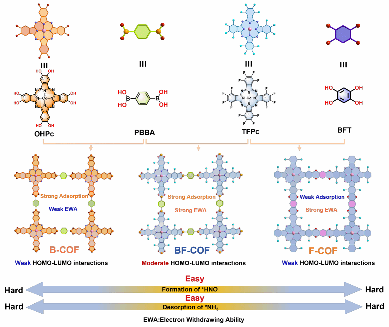 研究团队基于分子工程策略通过亲核取代构筑了三种钴酞菁基共价有机框架催化剂,揭示了COF 中不同元素的修饰对其与NO分子的HOMO-LUMO 相互作用的调控规律,以及该相互作用与电催化氮氧化物还原反应中关键中间体形成及脱附过程的构效关系,阐明BF-COF中B(Lewis 酸性增强 NO 吸附)与F(调控电子环境)协同优化活性位点微环境的结构优势与作用为理解分子结构对催化性能的调控机制提供了直观的科学表征。