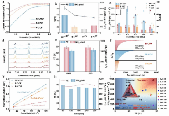 (2) 实验结果表明,BF-COF有利于*HNO的形成和*NH3中间体的脱附,因此表现出1166.67μg cm-2·h-1的氨产率和82.27%的法拉第效率。该研究结果构成了COFs用于NORR的首个实验实例,同时在此反应中超越了大多数已报道的电催化剂。