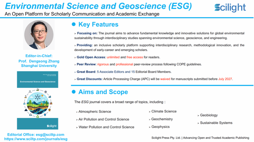 Environmental Science and Geoscience(ESG)期刊由国际化开放获取出版社Scilight Press于近期创立。ESG期刊始终致力于开放获取(Open Access)、图书出版与全球传播。自2022年成立以来,Scilight Press已正式出版42本学术期刊,其中2本被DOAJ收录,5本被Scopus数据库收录,1本被ESCI(Web of Science)收录,多本期刊正在接受各大数据库评估,Scilight Press出版社致力于打造具有国际影响力的学术出版与传播平台。